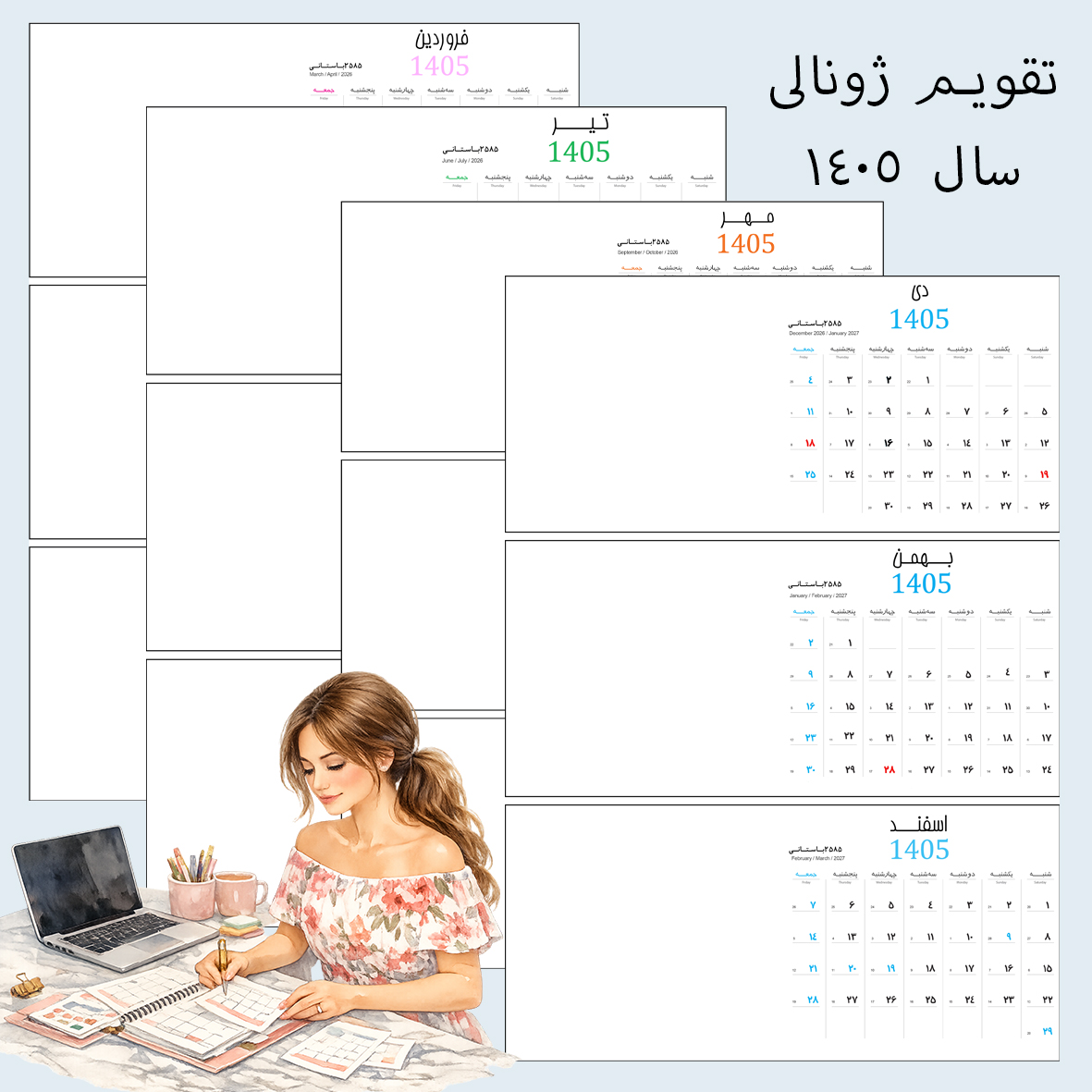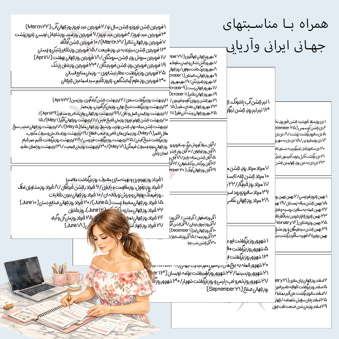 تقویم خاص خودتو بساز تقویم ژورنالی 1405 همراه با مناسبتهای جهانی وایرانی جنس کتد گرم بالا سایز رومیزی 9*21 طراحی تخصصی پیچک گالری